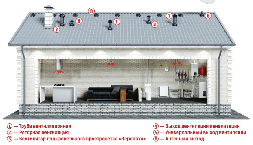 Правильно сделать вентиляцию можно как на этапе строительства дома, так и при капитальном ремонте кровли. Выходы вентиляции канализации уберут вонь и смрад от сточных вод из дома. Эта проблема особенно актуальна в старых домах и она имеет простое и доступное по стоимости решение. Вентиляторы подкровельного пространства не позволят кровле сгнить от конденсата. Для них придумано специальное название «Черепаха» за внешнее сходство с этим животным.