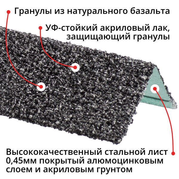 Планки, покрытые гранулами из натурального базальта, сохраняют цвет в течение всего срока службы и придают фасаду завершённый эстетичный вид. Произведенные на основе стального листа толщиной 0,45мм, покрытого с обеих сторон алюмоцинковым слоем, они не подвержены коррозии даже в местах среза при монтаже и в случае царапин на слое.