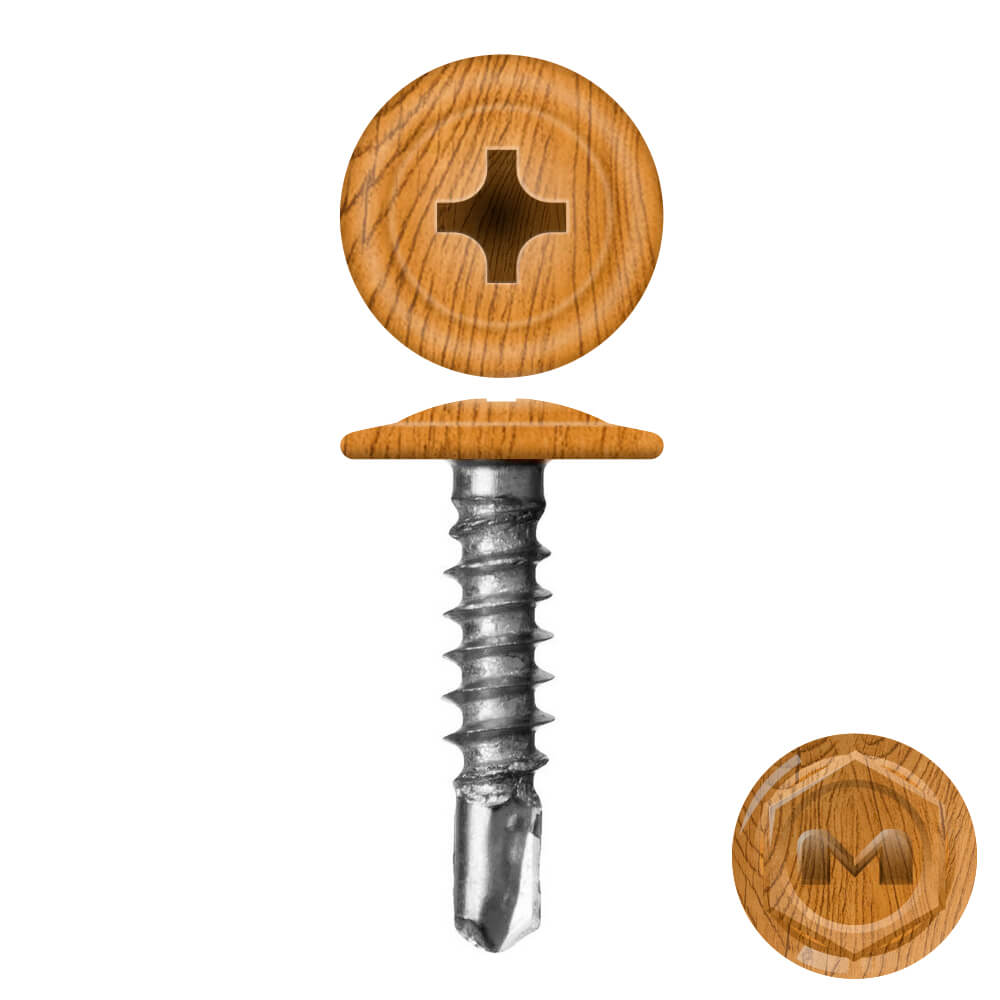 Саморезы премиум-качества Даксмер с пресс-шайбой ПШС сверло по металлу цветом Орех, Золотое дерево 4,2х16мм имеют глубокий шлиц - phillips № 2, что позволяет закручивать изделие быстро и без срывов. Закаленная высокоуглеродистая сталь саморезов ПШС (сверло) позволяет просверливать лист металла толщиной до 5 мм. Саморезы с полусферической головкой, напрессованной шайбой со сверлом на конце, предназначены для монтажных работ, крепления разнообразных изделий и материалов к металлическим каркасам. Оцинкованные, наконечник - сверло. Покраска в цвета RAL производится на автоматическом оборудовании европейского производства.