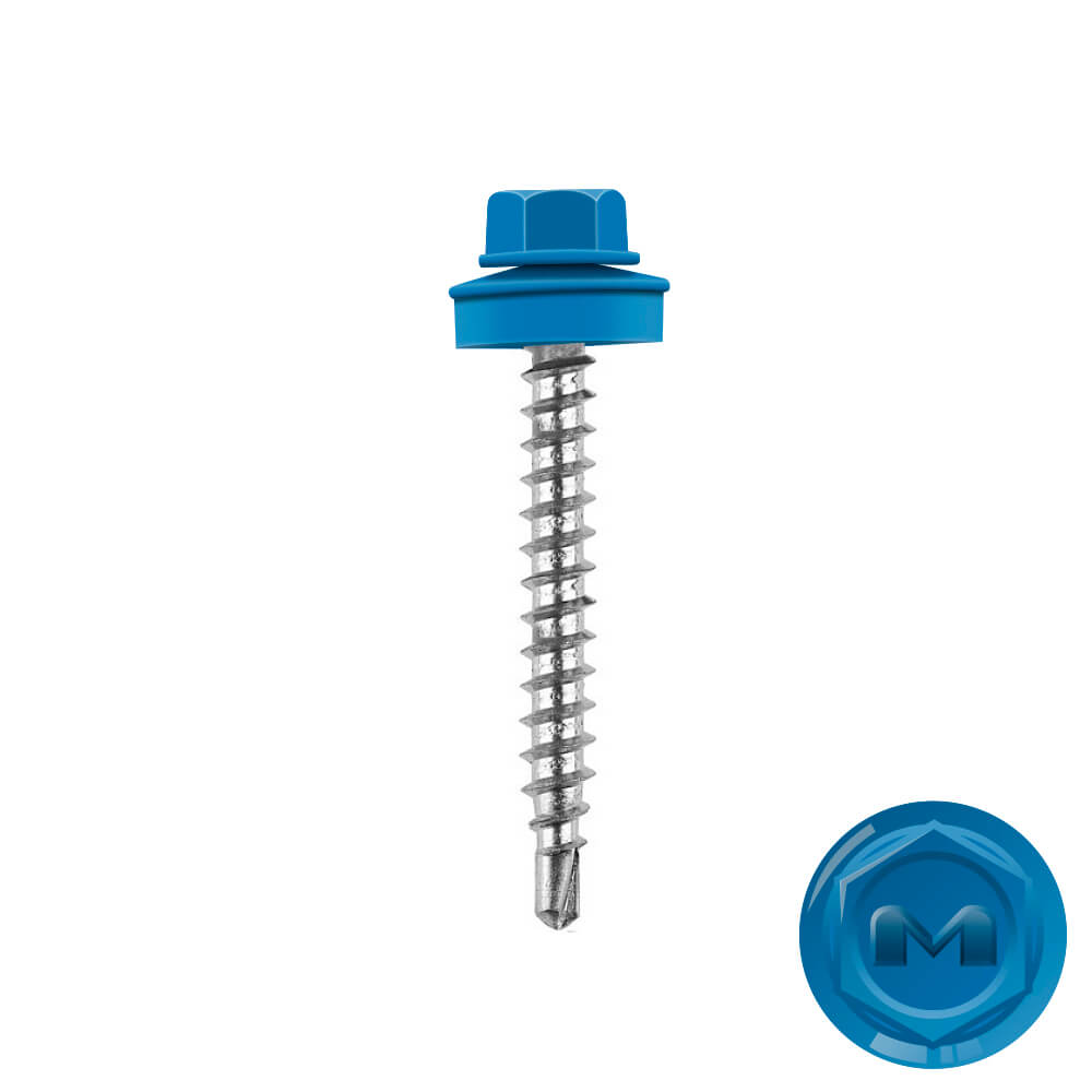 Кровельные саморезы Daxmer (Даксмер) по дереву цветом RAL5015 Небесно-Голубой 4,8*35мм окрашиваются УФ-стойкой полиэфирной порошковой краской. Цинковое антикоррозийное покрытие обеспечивает длительный срок службы саморезов (не менее 25 лет). Специальная металлическая шайба с ЕРDМ - уплотнителем обеспечивает плотное прилегание профилированного металла (кровли) к деревянной обрешетке, а также препятствует попаданию влаги.