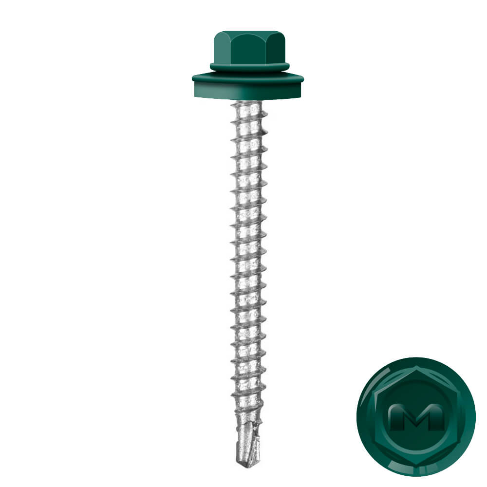 Кровельные саморезы Daxmer (Даксмер) по дереву цветом RAL6005 Зеленый мох 4,8*50мм окрашиваются УФ-стойкой полиэфирной порошковой краской. Цинковое антикоррозийное покрытие обеспечивает длительный срок службы саморезов (не менее 25 лет). Специальная металлическая шайба с ЕРDМ - уплотнителем обеспечивает плотное прилегание профилированного металла (кровли) к деревянной обрешетке, а также препятствует попаданию влаги.