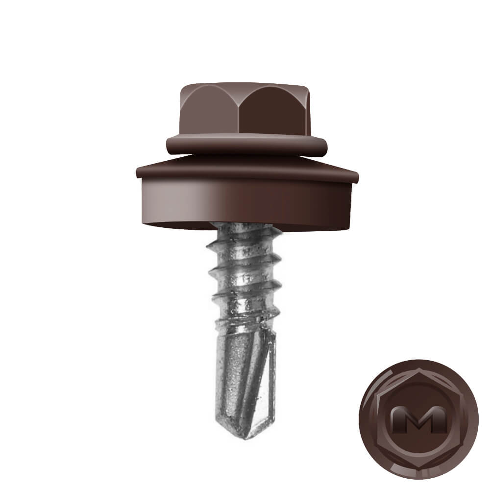 Кровельные саморезы Daxmer (Даксмер) по металлу цветом RAL8017 Коричневый Шоколад 5,5*19мм имеют частую резьбу, а специальная металлическая шайба с ЕРDМ-уплотнителем 2,8 мм обеспечивает плотное прилегание профилированного металла (кровли) к обрешетке, а также препятствует попаданию влаги. Также ЕРDМ-уплотнитель защищает от перепада температур (за счет высокого содержания каучука), который адаптируется под окружающую температуру и не позволяет кровле или забору «гулять», плотно прижимая листы к основанию.