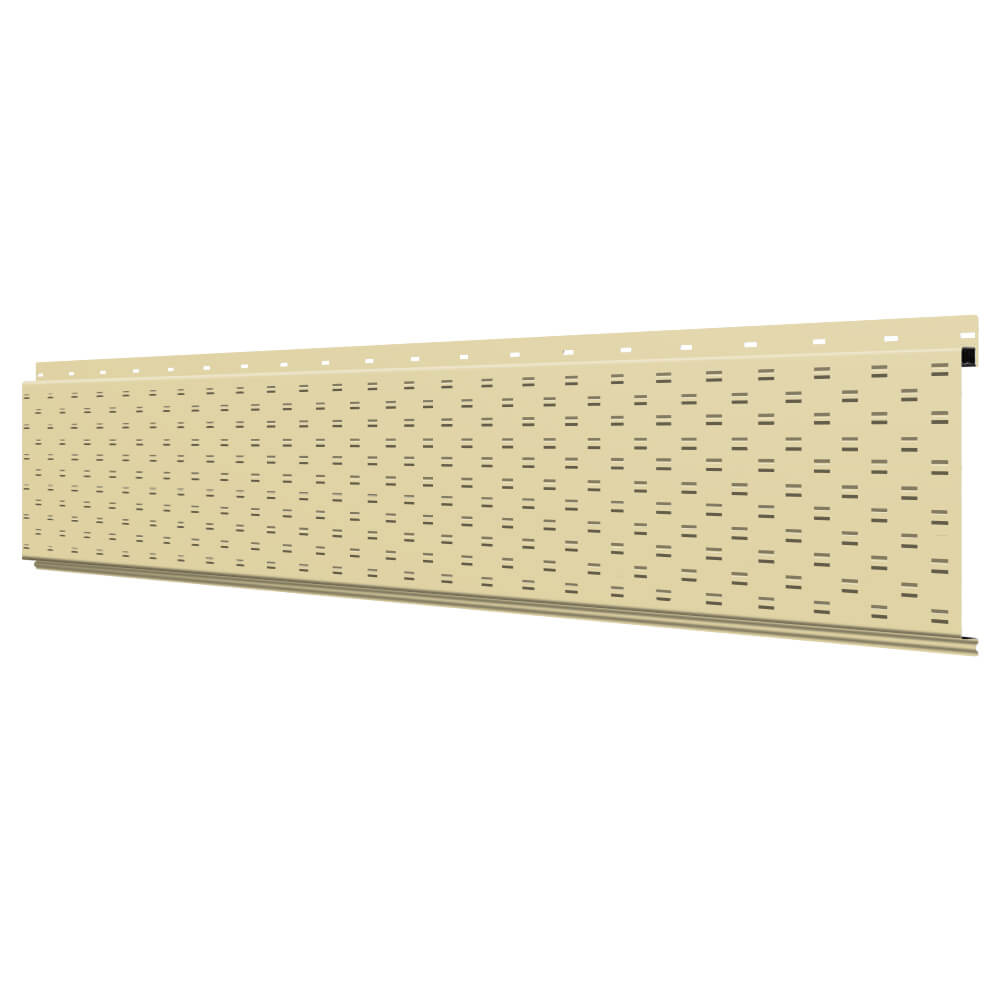Линеарная потолочно-стеновая панель с ПЕРФОРАЦИЕЙ для вентиляции цвет RAL1014 Бежевый применяется в качестве софитов для подшивы крыши, наружной и внутренней отделки потолков, стен, фронтонов фасада дома в Твери.