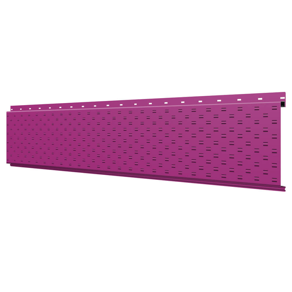Линеарная потолочно-стеновая панель с ПЕРФОРАЦИЕЙ для вентиляции цвет RAL4006 Пурпурный применяется в качестве софитов для подшивы крыши, наружной и внутренней отделки потолков, стен, фронтонов фасада дома в Твери.