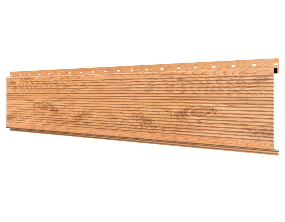Линеарная потолочно-стеновая панель РИФЛЕНАЯ усиленная цвет под дерево Клен Светлый 3Д SteelArt Россия применяется в качестве софитов для подшивы крыши, наружной и внутренней отделки потолков, стен, фронтонов фасада дома в Твери.