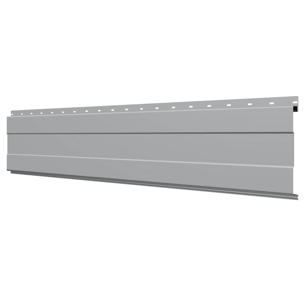 Линеарная потолочно-стеновая панель с ПОЛОСОЙ усиленная цвет RAL7004 Серый применяется в качестве софитов для подшивы крыши, наружной и внутренней отделки потолков, стен, фронтонов фасада дома в Твери.